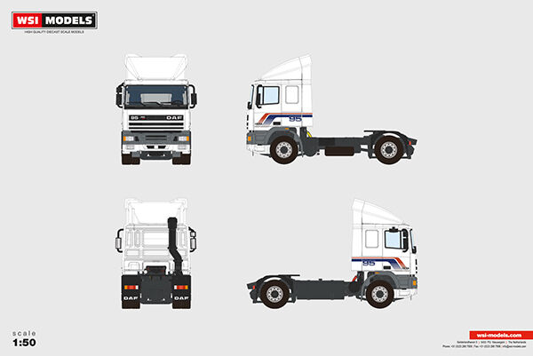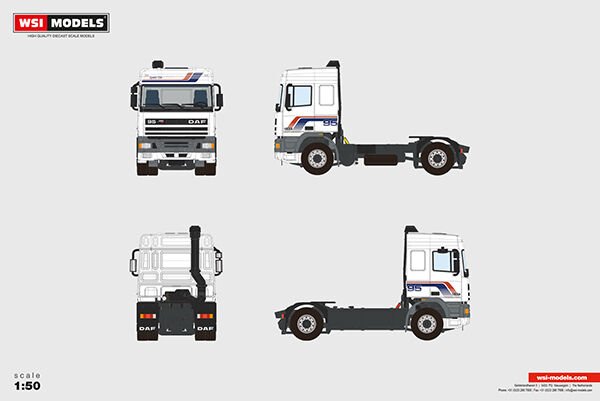 At WSI Models, we have developed the iconic DAF 95 (1st and 2nd generation) in 1:50 scale with great care. Both generations feature a detailed interior and realistic chassis components, making them convincing and recognizable to every collector.